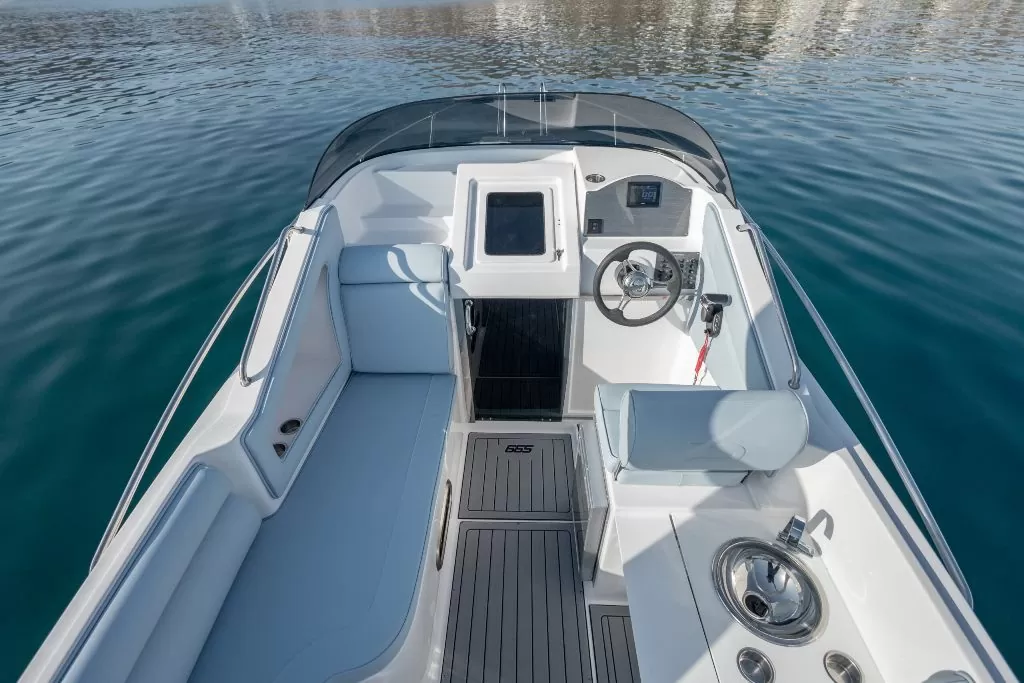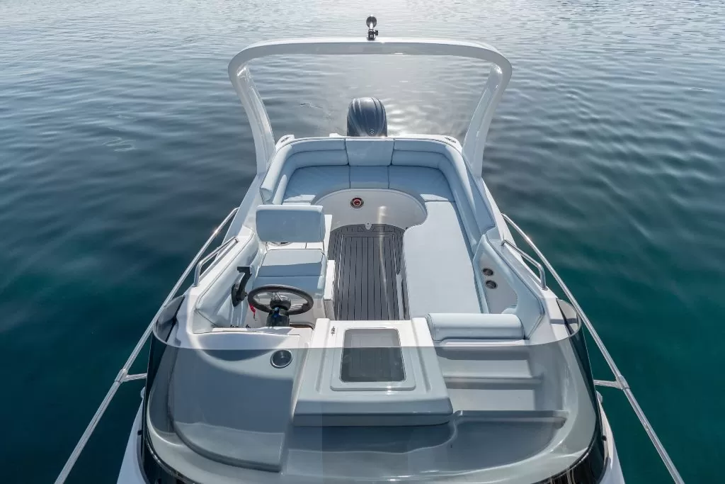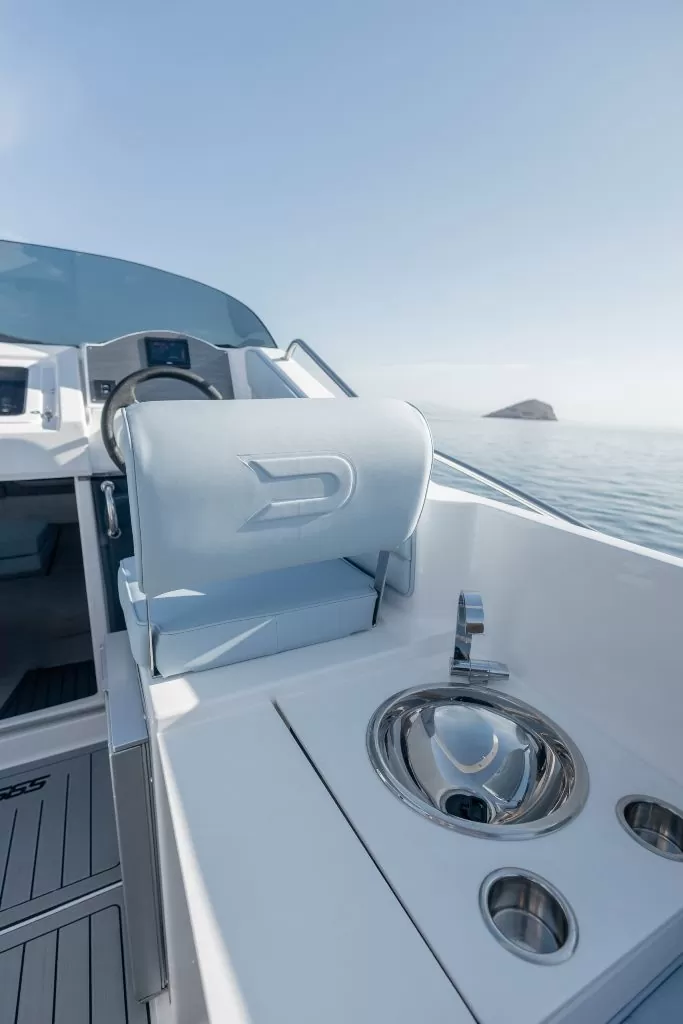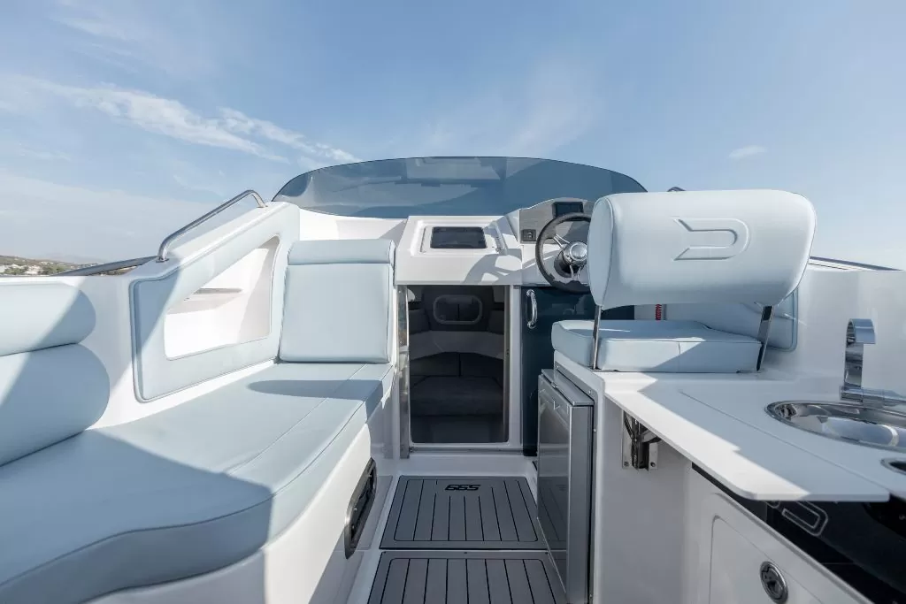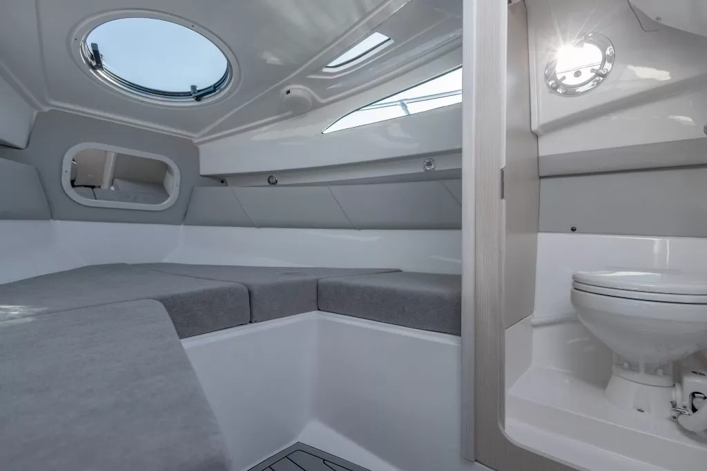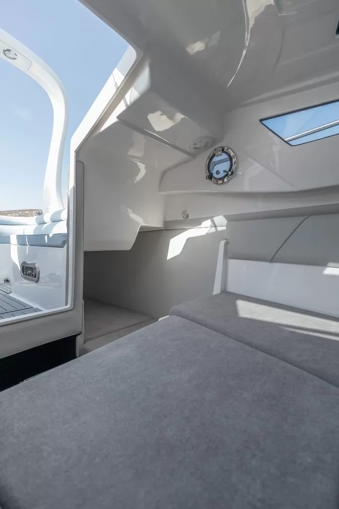 A tágas kabin megőrizte jellegzetes kényelmét, most egy harmadik felnőtt számára pótággyal bővítve. A továbbfejlesztett fülke egy hatékony wet bárral és egy fényűző napozóterasszal rendelkezik a társvezető oldalán. A figyelemre méltó jellemzők közé tartozik a funkcionális konzol félig dupla, rendkívül kényelmes vezetőüléssel, valamint az opcionális hátsó platformok a sokoldalúság növelése érdekében. Ez a sportcsónak tökéletes társ a felejthetetlen vízi emlékek megteremtéséhez.